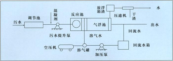 通過加藥混凝的污水進(jìn)入氣浮池中,由溶氣罐中的溶氣水在進(jìn)出水管口下部由溶氣釋放器突然減壓,使溶解于水中的空氣由突然減壓而釋放出大量的微氣泡。微氣泡在上升過程中遇到污水中已經(jīng)凝聚的懸浮物,微氣泡附著在懸浮物上,使之很快上浮,這樣污水中處理掉的懸浮物全部浮于上面。然后通過氣浮上部的刮沫機(jī)把它們刮去排到污泥池中,而池底部通過處理的清水排出。
